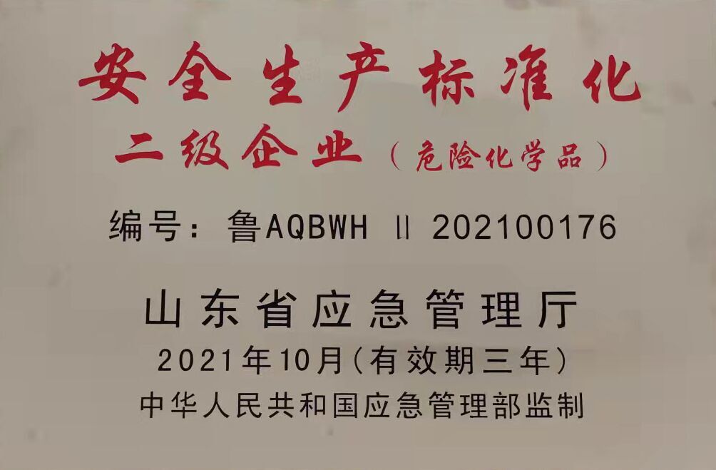 近日,山東東臨新材料股份有限公司獲得了由國家應急管理部監制、山東省應急管理廳頒發(fā)的“安全生產(chǎn)標準化二級企業(yè)”證書(shū)。